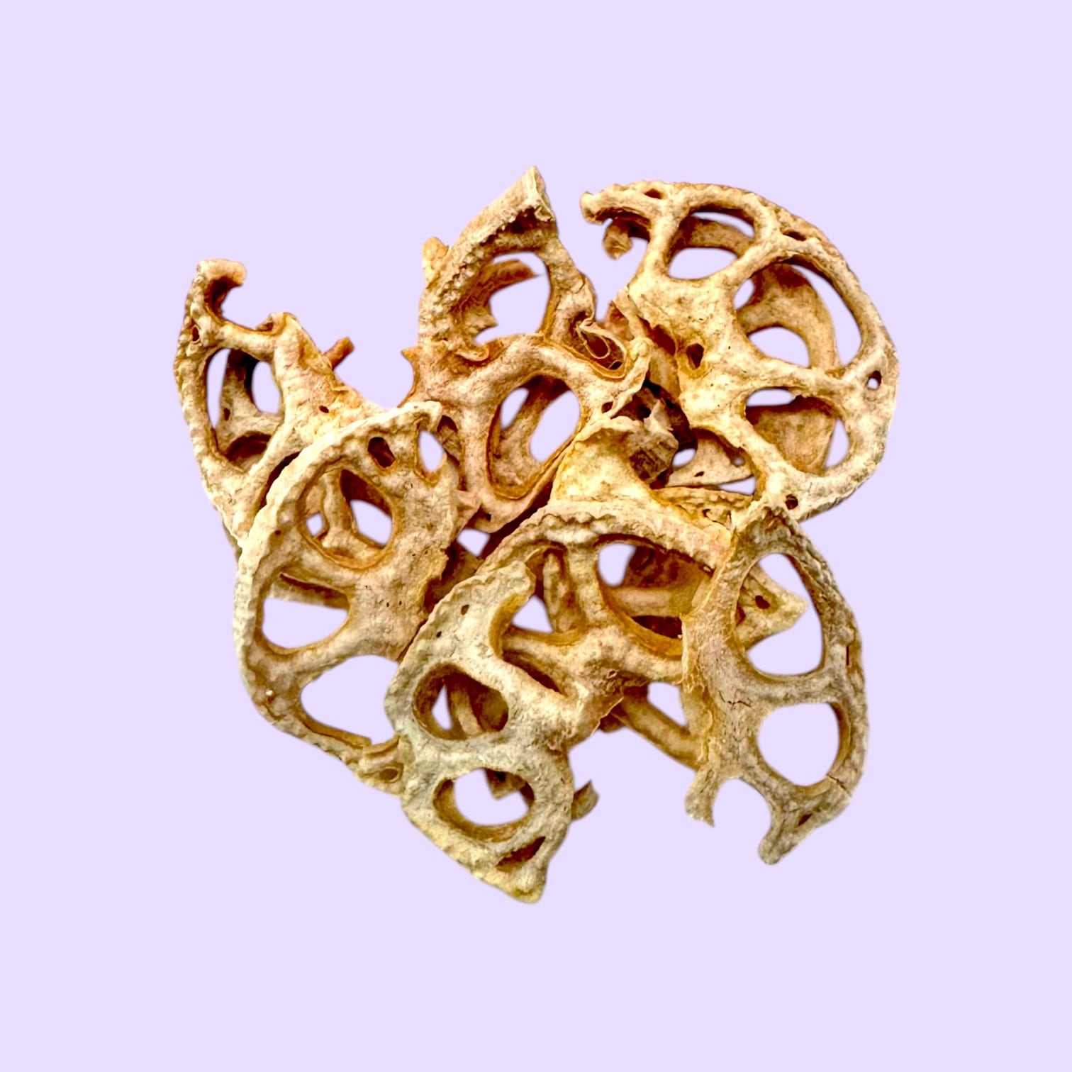 乾燥の過程でれんこんが黒っぽく変色することがあります。これはポリフェノール等の成分が酸化したものであり、品質に問題はございません。